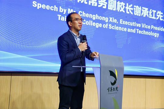 參觀學(xué)校游泳館、電影院、圖書館、工程實訓(xùn)中心、育英書院后,泰山科技學(xué)院為全體學(xué)員舉辦見面歡迎會。泰山科技學(xué)院常務(wù)副校長謝承紅致歡迎辭,他引用孔子“有朋自遠方來,不亦樂乎?”表達對來賓的歡迎,并介紹了學(xué)校結(jié)合泰山文化及新教育理念所做的育人探索,祝愿大家在泰科度過美好時光。蓬萊科幻學(xué)院副院長宋亞潔以全英文方式,介紹學(xué)校發(fā)展歷程、育人理念、辦學(xué)特色、校園文化、辦學(xué)成果和發(fā)展愿景,她還特別呈現(xiàn)了學(xué)校在國際化辦學(xué)實踐中的探索,介紹了學(xué)校留學(xué)生來校學(xué)習(xí)的政策,歡迎21個“一帶一路”共建國家及世界各國的學(xué)生、友人到泰山科技學(xué)院留學(xué)、訪學(xué)。