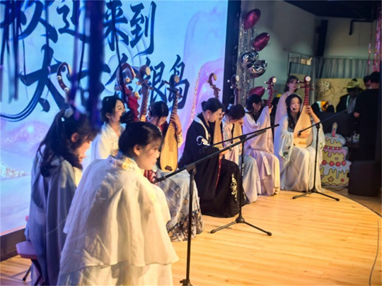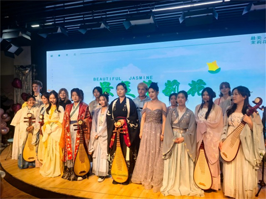 在酒會(huì)間歇,來(lái)自國(guó)際交流學(xué)院的留學(xué)生們一起登臺(tái),指尖輕撥琵琶弦,《茉莉花》的悠揚(yáng)旋律隨即在會(huì)場(chǎng)響起。這段不到三分鐘的演奏,成為酒會(huì)現(xiàn)場(chǎng)最溫暖的“文化共鳴點(diǎn)”也為后續(xù)的跨文化交流環(huán)節(jié)埋下伏筆成為跨文化協(xié)作的生動(dòng)體現(xiàn)。