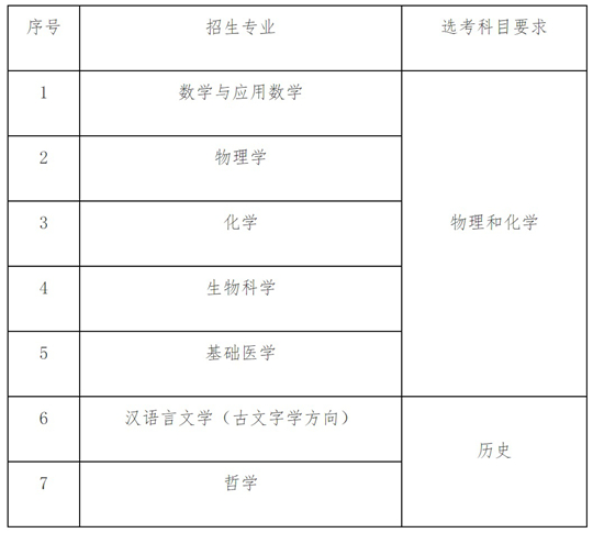 為突出基礎學科在國家關鍵領域的支撐引領作用,同時聚焦國家人才緊缺的人文社會科學領域,我校強基計劃招生專業(yè)設置如下:數學與應用數學、物理學、化學、生物科學、基礎醫(yī)學、漢語言文學(古文字學方向)﹑哲學,具體分省分專業(yè)招生計劃以報名系統(tǒng)內公布為準。