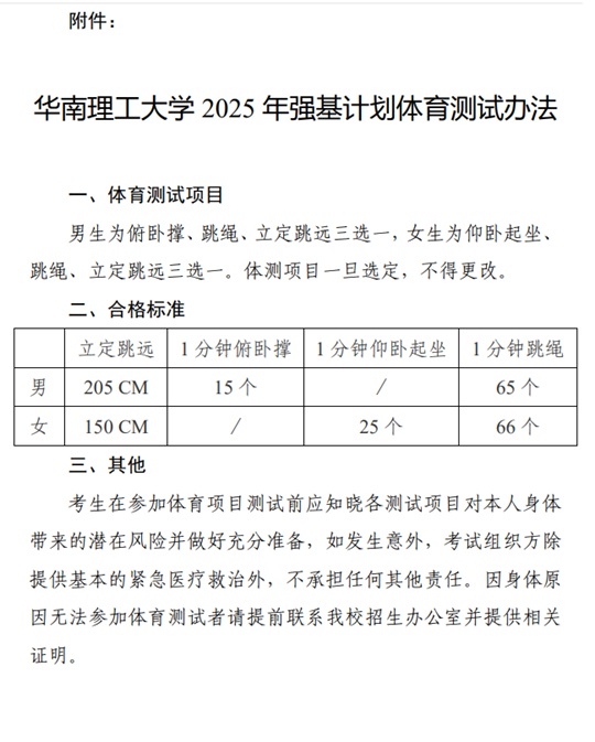 附件:華南理工大學(xué)2025年強(qiáng)基計(jì)劃體育測(cè)試辦法.pdf(點(diǎn)擊查看)