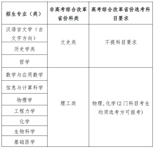 四川大學(xué)強(qiáng)基計(jì)劃招生專業(yè)為漢語言文學(xué)(古文字方向)、歷史學(xué)類(含歷史學(xué)、考古學(xué)、文物與博物館學(xué)專業(yè))、哲學(xué)、數(shù)學(xué)與應(yīng)用數(shù)學(xué)、信息與計(jì)算科學(xué)、物理學(xué)、工程力學(xué)、化學(xué)、生物科學(xué)、基礎(chǔ)醫(yī)學(xué)。