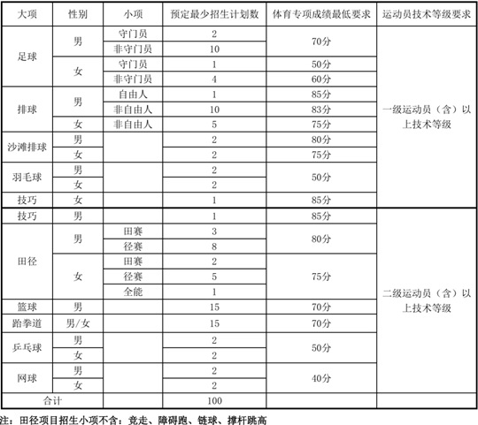 2.各項(xiàng)目預(yù)定最少招生計(jì)劃數(shù)及運(yùn)動(dòng)員技術(shù)等級要求: