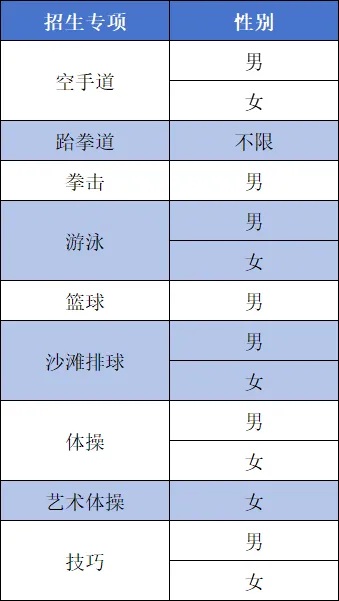 (五)我校依據(jù)梯次順序,優(yōu)先錄取一志愿,未完成招生計(jì)劃的項(xiàng)目,再錄取二志愿。二志愿錄取期間進(jìn)行計(jì)劃調(diào)整:同項(xiàng)目內(nèi)男女間生源不均衡,優(yōu)先在該項(xiàng)目中相互調(diào)整。其余仍未完成招生計(jì)劃的項(xiàng)目,剩余計(jì)劃按如下順序調(diào)整:籃球項(xiàng)目→沙灘排球項(xiàng)目→空手道項(xiàng)目→跆拳道項(xiàng)目→游泳項(xiàng)目→拳擊項(xiàng)目→體操項(xiàng)目→藝術(shù)體操項(xiàng)目→技巧項(xiàng)目。