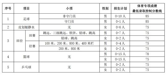 1.文化成績、體育專項(xiàng)成績均須達(dá)到我校劃定的最低錄取控制分?jǐn)?shù)線:文化成績不低于150分,對具備運(yùn)動健將技術(shù)等級的考生,文化成績不低于130分;體育專項(xiàng)成績:足球項(xiàng)目不低于85分,男子籃球項(xiàng)目不低于78分,其他項(xiàng)目不低于75分。