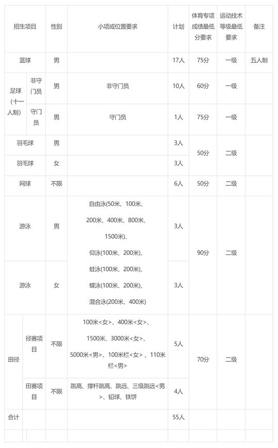 (2)足球(男子,十一人制)項(xiàng)目招收一級(jí)及以上運(yùn)動(dòng)等級(jí)運(yùn)動(dòng)員,非守門員項(xiàng)目體育專項(xiàng)成績不低于60分,守門員項(xiàng)目體育專項(xiàng)成績不低于75分。