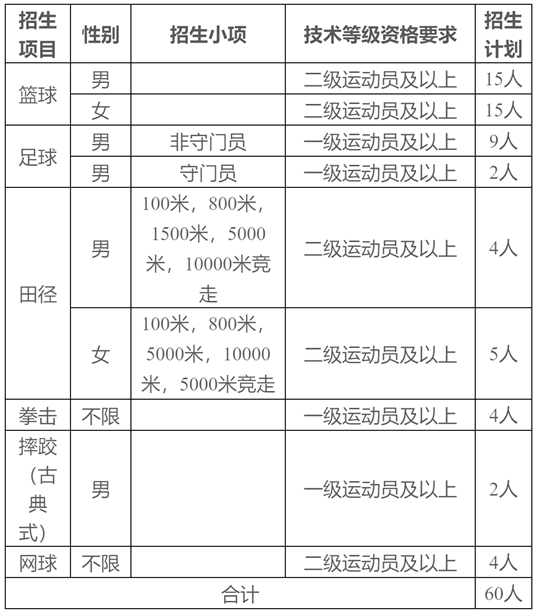 注:以上各招生項(xiàng)目最終錄取人數(shù)將視生源情況確定,學(xué)?蓪(duì)招生計(jì)劃進(jìn)行項(xiàng)目間調(diào)整;@球項(xiàng)目考生使用五人或三人籃球運(yùn)動(dòng)員技術(shù)等級(jí)證書均可報(bào)名,按照籃球項(xiàng)目考試方法與評(píng)分標(biāo)準(zhǔn)參加籃球?qū)m?xiàng)測(cè)試。
