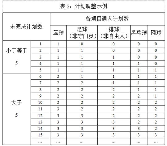 以單個計劃數(shù)的形式,按照籃球、足球(非守門員)、排球(非自由人)、乒乓球、網(wǎng)球的順序,按照輪次依次調(diào)入五個項目(無生源的項目輪空),以此類推,調(diào)完為止。例(見表3):