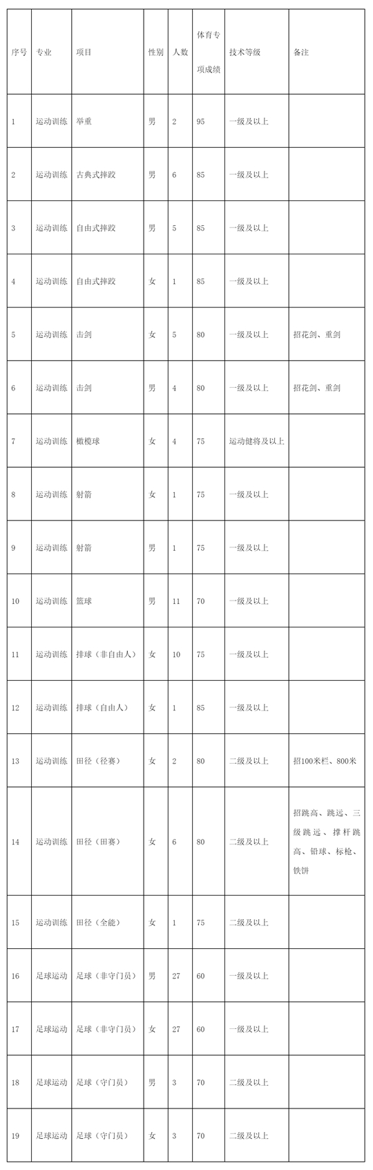 2.運動訓練專業(yè)招生計劃為60人,足球運動專業(yè)招生計劃為60人,最終錄取人數(shù)視生源情況及上級主管部門批復決定。