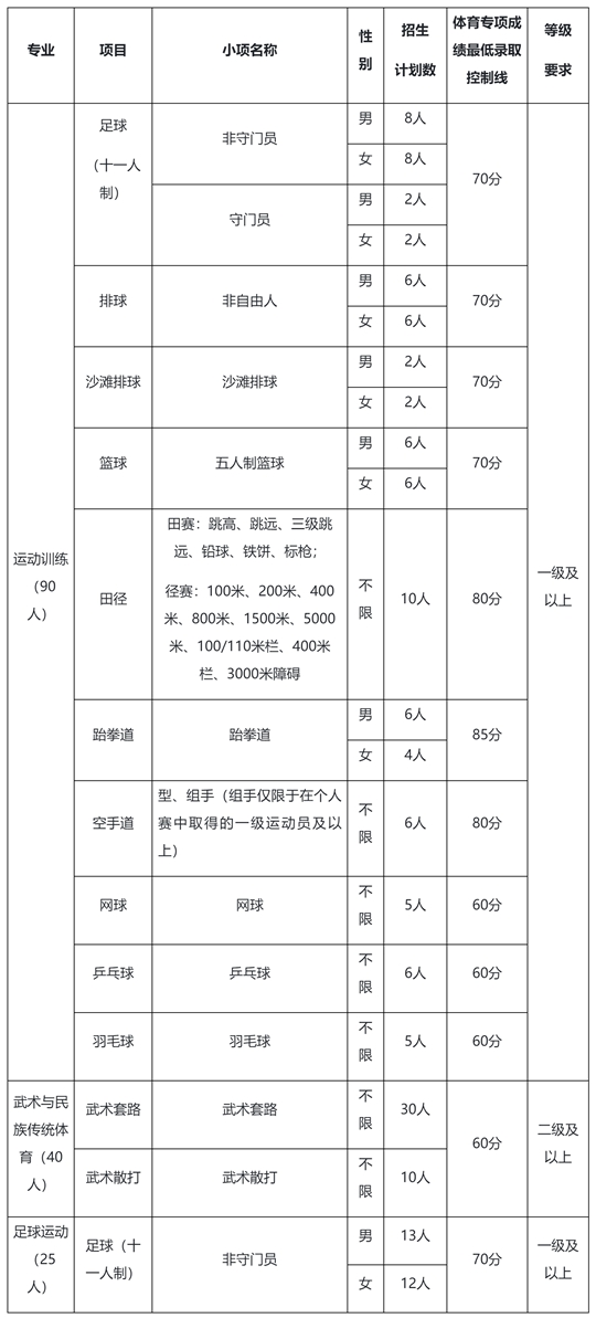 1.運(yùn)動(dòng)訓(xùn)練專業(yè)招生項(xiàng)目:足球(十一人制)、排球(非自由人)、籃球(五人制)、跆拳道、空手道、田徑、乒乓球、羽毛球、網(wǎng)球、沙灘排球。