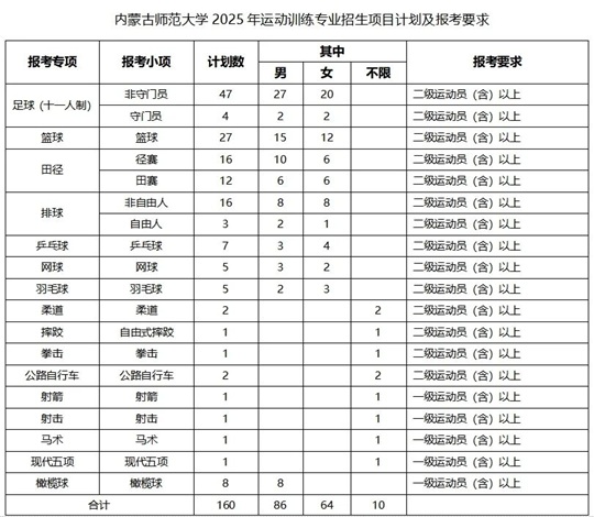 2025年運動訓練專業(yè)面向全國招生160人。招生計劃納入內(nèi)蒙古師范大學年度本科招生計劃總規(guī)模,具體項目見下表: