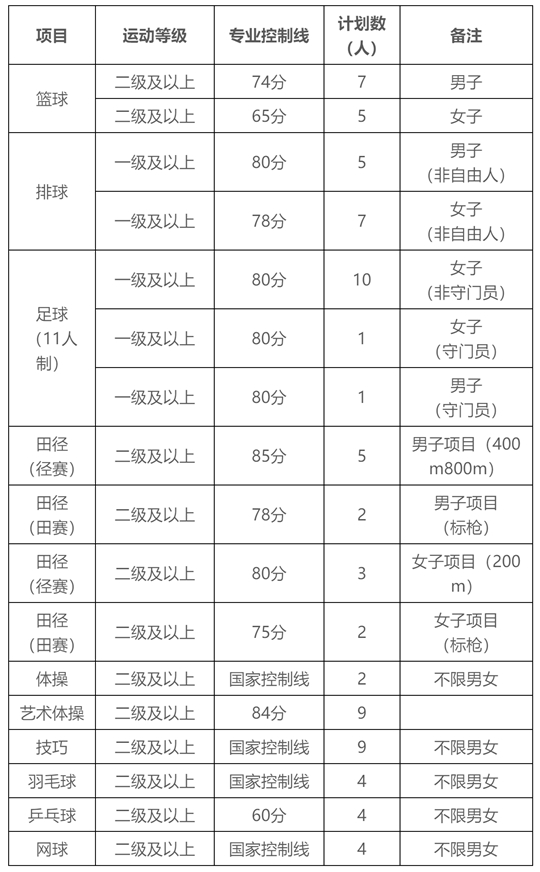 。ǘ⿲I(yè)成績錄取控制線:在不低于國家控制線的基礎上,由我校確定本校專業(yè)成績錄取控制線和運動等級如下: