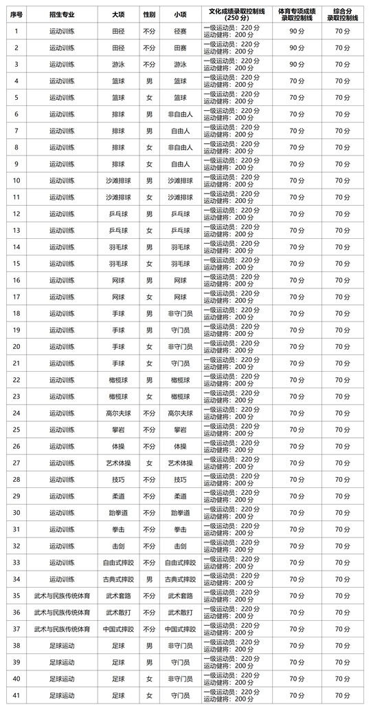 2.運(yùn)動訓(xùn)練專業(yè)招生計(jì)劃為280人,武術(shù)與民族傳統(tǒng)體育專業(yè)招生計(jì)劃為80人,足球運(yùn)動專業(yè)招生計(jì)劃為60人,招生計(jì)劃含保送錄取優(yōu)秀運(yùn)動員。