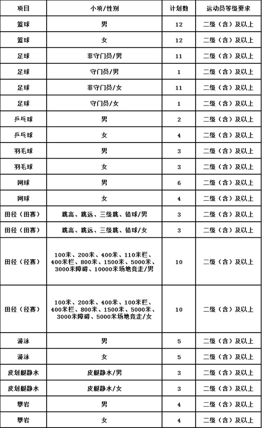 (二)具備我校招生項(xiàng)目的二級(含)以上運(yùn)動(dòng)員技術(shù)等級稱號。考生運(yùn)動(dòng)員技術(shù)等級以“國家體育總局運(yùn)動(dòng)員技術(shù)等級系統(tǒng)”數(shù)據(jù)信息為準(zhǔn)?忌救说倪\(yùn)動(dòng)員技術(shù)等級項(xiàng)目應(yīng)與報(bào)考的招生項(xiàng)目一致,考生如具備所報(bào)考項(xiàng)目的多個(gè)運(yùn)動(dòng)員技術(shù)等級證書,報(bào)名時(shí)需填報(bào)所有符合報(bào)名要求的運(yùn)動(dòng)員技術(shù)等級證書。(籃球項(xiàng)目考生使用籃球或三人籃球運(yùn)動(dòng)員技術(shù)等級證書均可報(bào)名,按照籃球項(xiàng)目考試方法與評分標(biāo)準(zhǔn)參加籃球?qū)m?xiàng)考試)。
