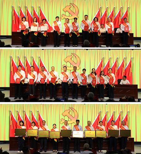 校黨委委員共同為優(yōu)秀共產(chǎn)黨員代表、優(yōu)秀黨務(wù)工作者代表、先進(jìn)基層黨組織代表頒獎(jiǎng)。