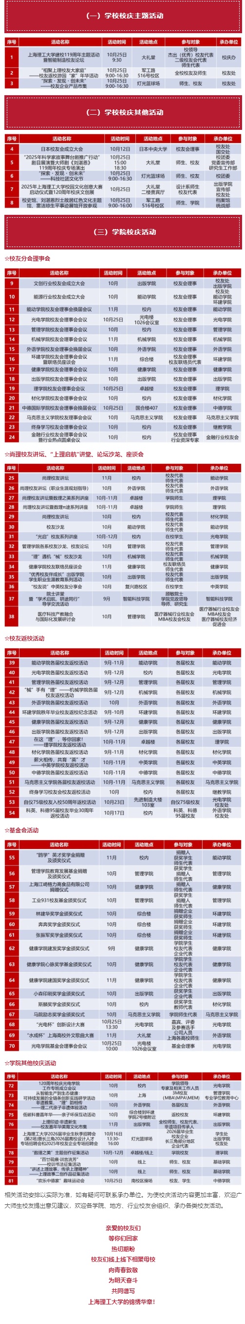 2025年10月25日,上海理工大學(xué)將迎來119周年校慶日。為進一步聯(lián)絡(luò)校友感情、增強校友活力、凝聚校友力量、傳承校友文化,更好地服務(wù)校友成長,建設(shè)“上理校友大家庭”,學(xué)校定于2025年10月25日(星期六)舉辦上海理工大學(xué)建校119周年校慶系列活動,誠摯邀請廣大校友重拾母校記憶、共祝母校生日,暢談合作、再敘深情。