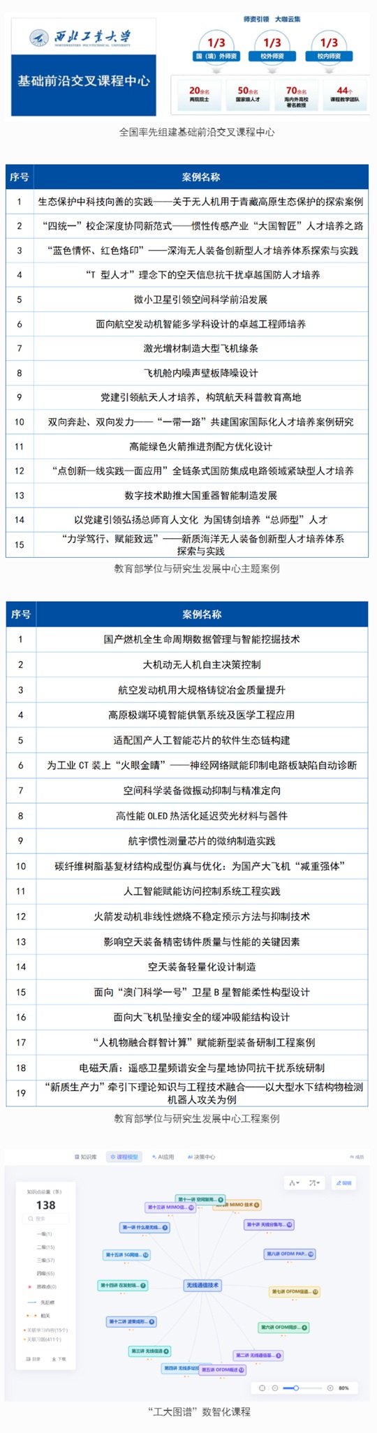 近期,中央教育工作領(lǐng)導(dǎo)小組印發(fā)《高等教育學(xué)科專業(yè)設(shè)置調(diào)整優(yōu)化行動(dòng)方案(2025—2027年)》,對深入推進(jìn)學(xué)科專業(yè)設(shè)置調(diào)整優(yōu)化工作作出系統(tǒng)部署,明確提出實(shí)施學(xué)科專業(yè)內(nèi)涵更新行動(dòng),加快教學(xué)內(nèi)容迭代,強(qiáng)化人工智能賦能教育教學(xué)。西北工業(yè)大學(xué)依托“工大圖譜”研究生數(shù)智化課程體系建設(shè),首批入選教育部教育強(qiáng)國建設(shè)三年行動(dòng)計(jì)劃綜合改革試點(diǎn)高校。