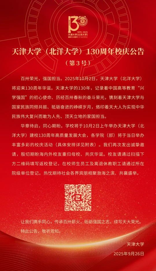 天津大學(xué)(北洋大學(xué))130周年校慶公告(第3號)