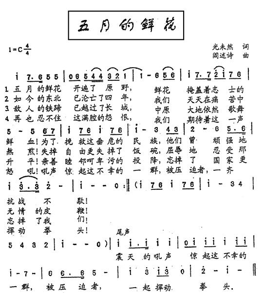 “一二·九”運(yùn)動(dòng),是學(xué)校流亡史上最悲壯、最輝煌的一頁,鑄就了學(xué)校光榮的愛國主義傳統(tǒng)。學(xué)校音樂教師閻紹璩被學(xué)生們視死如歸的凜然氣概所感染,把著名詩人光未然的《五月的鮮花》譜成了曲,這首歌從東北大學(xué)迅速傳遍全國,成為了家喻戶曉的抗日救亡歌曲。