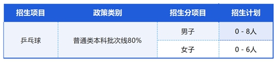 注:乒乓球項(xiàng)目招生計(jì)劃不超過(guò)14人,公示合格考生人數(shù)按教育部規(guī)定執(zhí)行,擇優(yōu)錄取、寧缺毋濫。已被有關(guān)高校運(yùn)動(dòng)訓(xùn)練、武術(shù)與民族傳統(tǒng)體育專(zhuān)業(yè)擬錄取的考生,不再參加高水平運(yùn)動(dòng)隊(duì)的選拔。