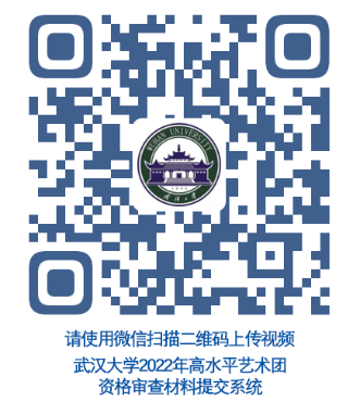 考生在教育部“陽(yáng)光高考平臺(tái)”報(bào)名完成后,需在2021年12月20日10:00至12月27日16:00期間上傳音像資料?忌鑼⑴c報(bào)考項(xiàng)目相關(guān)的藝術(shù)特長(zhǎng)制作成聲音、圖像清晰的MP4或AVI格式的音像資料,時(shí)長(zhǎng)不超過(guò)10分鐘,整個(gè)錄制過(guò)程需保證真實(shí)性、原始性,不得切換鏡頭拍攝或進(jìn)行后期編輯加工,不得出現(xiàn)任何與考生有關(guān)的個(gè)人信息;并將上述音像資料以“報(bào)名號(hào)+考試項(xiàng)目”的文件名上傳至武漢大學(xué)2022年高水平藝術(shù)團(tuán)資格審查材料提交系統(tǒng)(https://whu.gaokaobaoming.com,二維碼附后)。未按要求完成報(bào)名、報(bào)名材料不符合要求、音像資料不能播放等情況,一律視作報(bào)名無(wú)效。
