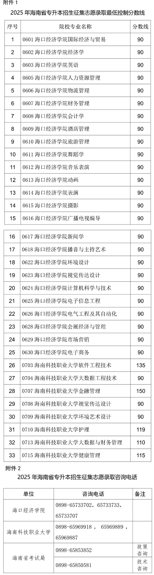附件:1.2025年海南省普通高等學校專升本招生征集志愿錄取最低控制分數(shù)線