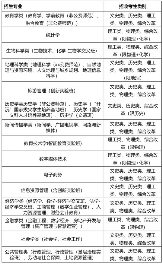備注:1.非高考綜合改革省份考生在系統(tǒng)報名時選擇文史類或理工類;實行“3+1+2”模式高考綜合改革省份考生選擇歷史類或物理類;實行“3+3”模式高考綜合改革省份考生在系統(tǒng)報名時選擇綜合改革類;在高考填報志愿時再填報具體專業(yè)(類)。2.我校最終在各省(市、區(qū))的招生專業(yè)以教育部批準的2025年分省分專業(yè)招生來源計劃為準。3.我校高校專項計劃不招收新疆雙語類考生。
