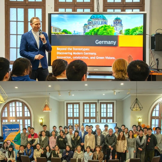 Innovation, Celebration, and Green Visions)為主題,引領(lǐng)大家走進一個充滿活力與創(chuàng)意的現(xiàn)代德國。他通過展示德國壯麗的自然風光、德語的獨特魅力、當?shù)刎S富多彩的嘉年華和音樂節(jié)等文化元素,逐步改變同學們對德國人“嚴肅”“古板”的傳統(tǒng)印象。克里斯蒂安老師以其風趣幽默的語言風格使活動現(xiàn)場充滿歡聲笑語,他還邀請學生體驗德國傳統(tǒng)習俗,通過請同學上臺體驗剪領(lǐng)帶、向觀眾席拋撒糖果等,為參與者們帶來了一場別樣的視聽體驗,讓大家重新認識了多元、開放、充滿活力的現(xiàn)代德國。