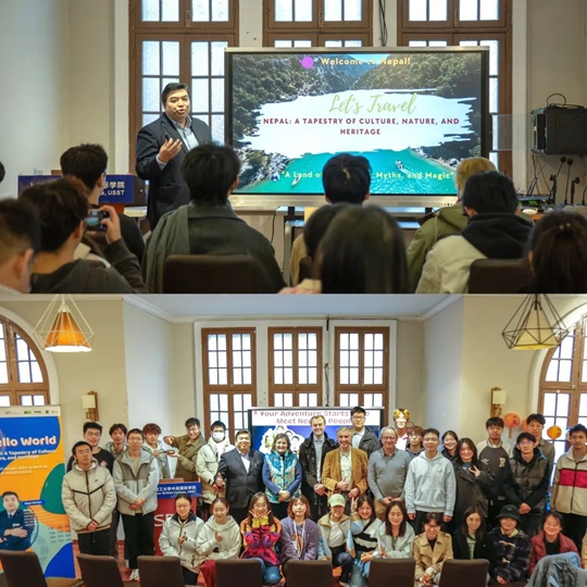 來自尼泊爾的會展經(jīng)濟與管理專業(yè)講師阿賈亞·沙迦(Ajaya Shakya),以“尼泊爾:文化、自然與傳承的織錦”(Nepal: A Tapestry of Culture, Nature, and Heritage)為主題,向同學們展示了尼泊爾美麗的自然風貌和獨特的人文特征。他不僅詳盡地介紹了尼泊爾的地理環(huán)境、民族構(gòu)成、傳統(tǒng)節(jié)日以及壯麗的自然風光,還熱情地分享了當?shù)刎S富多彩的美食文化,讓在場師生身臨其境領(lǐng)略到了尼泊爾這個神秘國度的非凡魅力。在講述尼泊爾獨特民族音樂時,阿賈亞老師邀請全場師生起立,隨著美妙旋律共舞,將現(xiàn)場氛圍推向了高潮。