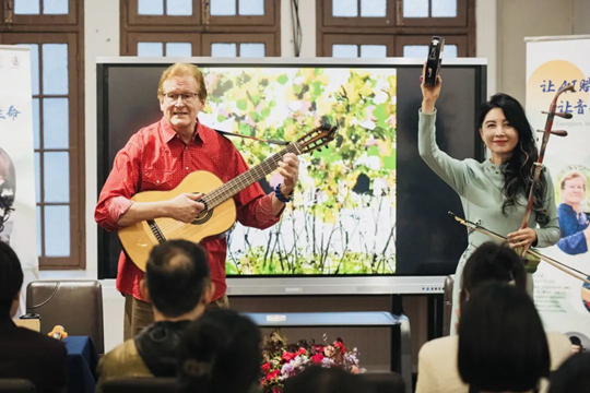 緊接著,馬曉輝教授與著名美國(guó)心理學(xué)教授、心理門診醫(yī)生Timothy A Kelly聯(lián)袂演繹美國(guó)鄉(xiāng)村音樂(lè)《Country Roads》,二胡的婉轉(zhuǎn)與非洲鼓的律動(dòng)相得益彰,現(xiàn)場(chǎng)觀眾自發(fā)加入合奏,將氣氛推向高潮。