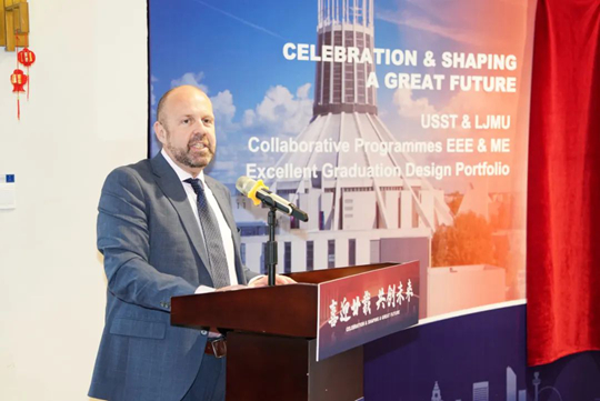 校長朱新遠致歡迎辭。他代表學校對倪克·斯莫一行來訪表示熱烈歡迎,回顧了兩校19年深厚淵源與合作成果,感謝利物浦市及利物浦約翰摩爾大學對學校發(fā)展的長期支持。他指出,上海理工大學優(yōu)勢學科眾多,與49個國家和地區(qū)的233所高校及研究機構建立了合作關系。利物浦約翰摩爾大學作為學校重要合作伙伴,雙方在中英國際學院共同舉辦的“電子信息科學與技術”和“機械設計制造及其自動化”兩個工科專業(yè)于2023年全部通過英國工程技術學會(IET)認證;2024年,兩校共同簽署了聯(lián)合培養(yǎng)博士項目協(xié)議,均為雙方在科研合作和高層次人才培養(yǎng)領域開辟了新的廣闊天地。朱新遠期待此次訪問進一步深化兩校及兩市合作,推動雙方在更多領域取得新突破。