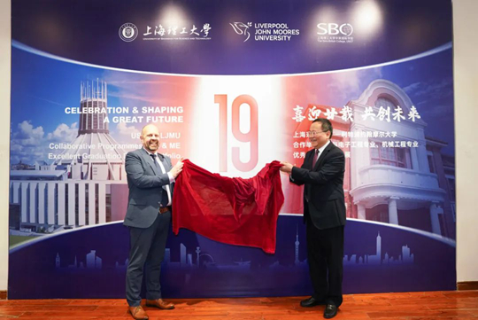活動中,校長朱新遠和倪克·斯莫共同為紀念兩校合作辦學19周年的展板揭幕。展板上的數(shù)字“19”象征著雙方19載中外合作辦學的輝煌歷程,也代表著19年來兩校共同書寫下的教育合作佳話。“9”與漢語“久”同音,寓意著上海市與利物浦市、上海理工大學與利物浦約翰摩爾大學的合作將源遠流長、歷久彌堅。雙方堅信,在即將到來的下一個19年里,攜手合作定能邁向新的高度,收獲更多碩果。