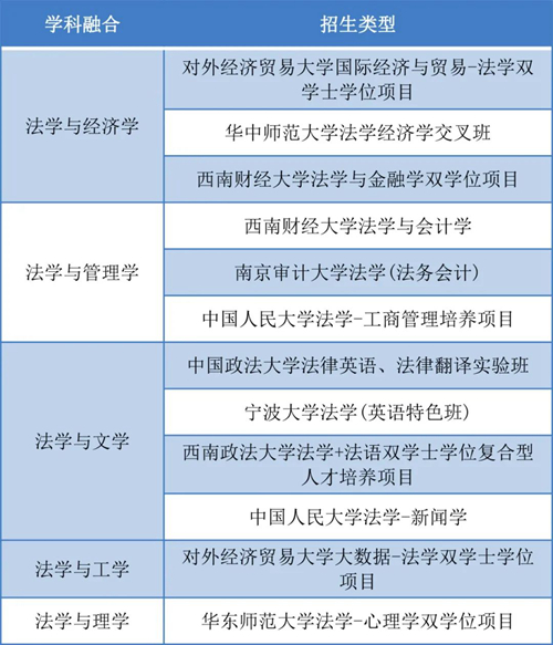 法學(xué)適用面廣,與其他學(xué)科交融互通形成交叉培養(yǎng)機制,可以提升學(xué)生的綜合素養(yǎng),拓寬知識廣度。因此,法學(xué)類專業(yè)常與其他學(xué)科形成雙學(xué)士交叉型、復(fù)合型培養(yǎng)模式。以下列舉法學(xué)與其他學(xué)科融合情況和對應(yīng)的招生類型。
