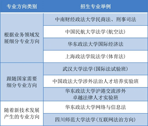 近年來,這種情況出現(xiàn)了一些變化,隨著業(yè)務(wù)細分程度更高,各個業(yè)務(wù)方向形成較高的壁壘,律師需要深耕于某一領(lǐng)域來增強競爭力。高校的人才培養(yǎng)也隨之細化,同一專業(yè)細分為不同方向。