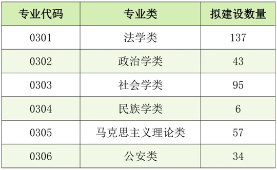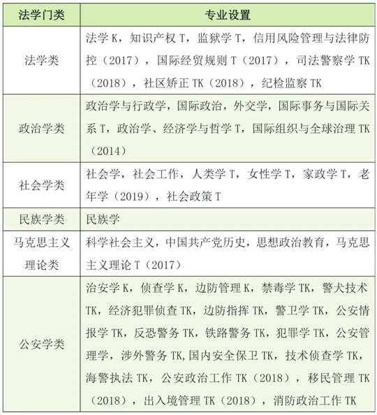 法學是普通高等學校本科專業(yè)目錄中12個學科門類之一,包括6個專業(yè)類,分別是法學類、政治學類、社會學類、民族學類、馬克思主義理論類、公安學類。具體專業(yè)設(shè)置見下表。